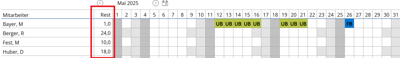 UrlaubsplanerUrlaubsübersichtIn der Kalenderansicht sehen Sie alle Abwesenheiten Ihrer Mitarbeiter. Als Administrator erkennen Sie die Abwesenheits-Art (Krank, Urlaub, Fortbildung etc.). Außerdem wird der aktuelle Resturlaub jedes zugeteilten Mitarbeitenden angezeigt, sodass Sie die verfügbaren Urlaubstage jederzeit im Blick haben.