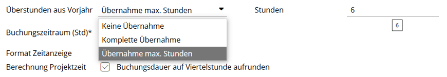 Ihre Mitarbeiter Ihre Zeiten nachtragen können. · angeben, ob Zeiterfassungen an Sonn- und Feiertagen zugelassen sind. · festlegen, ob Urlaubstage aus dem vergangenen Jahr ins aktuelle Jahr übertragen werden dürfen. · die Tage für den Urlaubsanspruch in Ihrem Unternehmen hinterlegen. Dieser Wert zieht sich dann als Standardeingabe beim Anlegen neuer Mitarbeiter. · die Tage für den Urlaubsanspruch in Ihrem Unternehmen hinterlegen. Dieser Wert zieht sich dann als Standardeingabe beim Anlegen neuer Mitarbeiter. · den Buchungszeitraum in Stunden für die Zeiterfassung definieren. Damit wird das Intervall festgelegt, in dem eine passende Buchung gesucht wird. Dieser Zeitraum ist bei Nachtschichten relevant: So wird bei der zweiten Buchung geprüft, ob z.B. max. 12 Std. zuvor eine andere Buchung angefangen wurde, die zum Vortag gehört. In diesem Fall werden die Stunden unter dem Vortag erfasst. · das Format der Zeitanzeige wählen. Die Standardanzeige ist in Dezimalzahlen. Setzen Sie das Häkchen, wenn Sie die Anzeige im Format HH:MM bevorzugen. · die Berechnung der Projektzeit aufrunden lassen. Wählen Sie das Häkchen, wenn die die Buchungsdauer bei Projekten auf Viertelstunden aufrunden möchten. Die Arbeitszeitbuchungen sind dabei nicht betroffen. · die wöchentliche und tägliche Arbeitszeit angeben. Dieser Wert zieht sich dann als Standardeingabe beim Anlegen neuer Mitarbeiter. ÜberstundenIm Rahmen der Jahresübertragung können Sie festlegen, ob